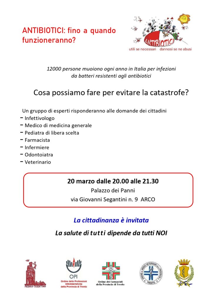 Venerdì 20 marzo 2026 ad Arco gli Ordini (Infermieri, Medici, Farmacisti, Veterinari) incontrano i cittadini: “Antibiotici, fino a quando funzioneranno?”