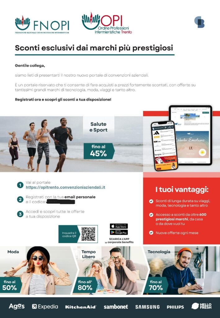 Si comunica che la FNOPI ha stipulato, a titolo completamente gratuito, una convenzione con la Società Corporate Benefits Italia S.r.l.. Grazie a questo accordo, tutti gli iscritti potranno accedere a un portale dedicato, attraverso il quale usufruire di sconti esclusivi, tariffe agevolate e promozioni riservate su una vasta gamma di beni di consumo, servizi alla persona, viaggi, tecnologia e tempo libero.